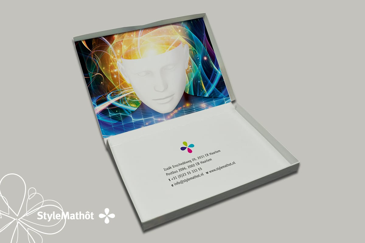 Bij het presenteren van een product of dienst, gaat het niet alleen om de inhoud maar ook om de verpakking. Deze scharnierdoos is verkrijgbaar in meerdere formaten en wordt volledig bedrukt in uw huisstijl. Afwerking met zilver- of goudfolie is ook mogelijk.